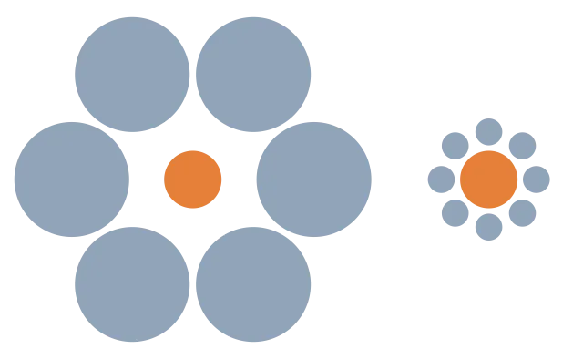 Die berühmteste Version dieser optischen Illusion: Zwei Kreise in der gleichen Größe, die nahe beieinander liegen. Der erste Kreis ist jedoch von viel größeren Kreisen umringt, während der zweite Kreis von Kleineren umringt ist.