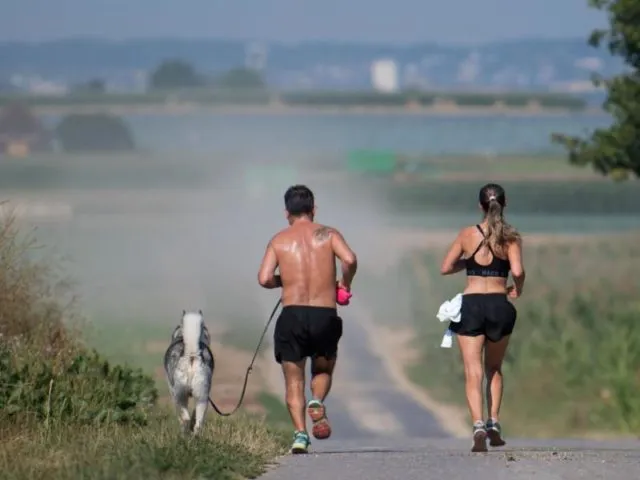 Hitze egal: Zwei leicht bekleidete Jogger laufen mit ihrem Hund auf einem Feldweg.
