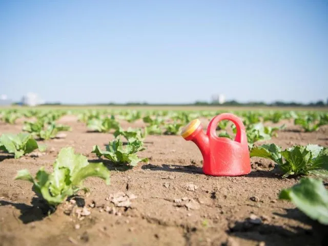 Auf einem Feld bei Filderstadt in Baden-Württemberg steht eine Spielzeuggießkanne zwischen Salatpflanzen. Der Boden hat Wasser dringend nötig.