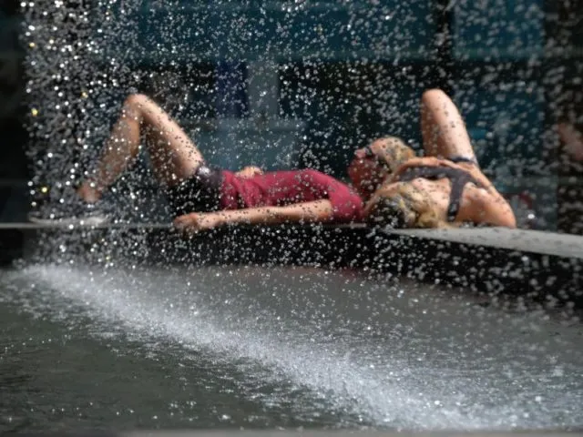 Einen idealen Platz in der Hitze haben sich diese Kinder in Berlin ausgesucht.