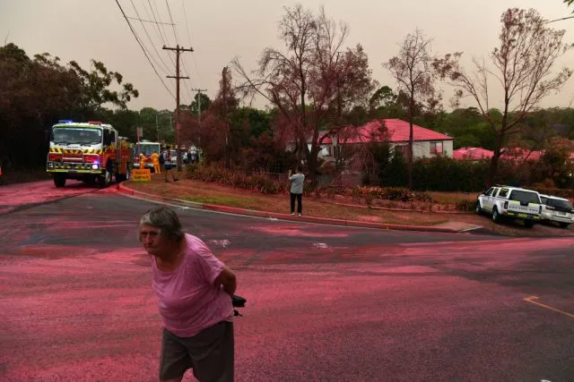 SYDNEY, AUSTRALIEN – 12. November 2019: Eine Bewohnerin geht vor Häusern in Südturramurra spazieren, nachdem Feuerwehrkräfte die Region aus der Luft mit rotem Brandschutzmittel zur Abwehr der Brände besprüht hatte.