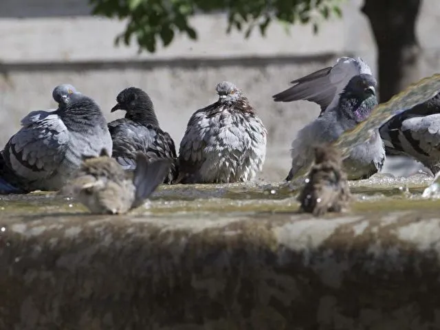 Vogel-Vollversammlung: Tauben und Spatzen sitzen in Berlin am Brunnen vor dem Rathaus Neukölln.