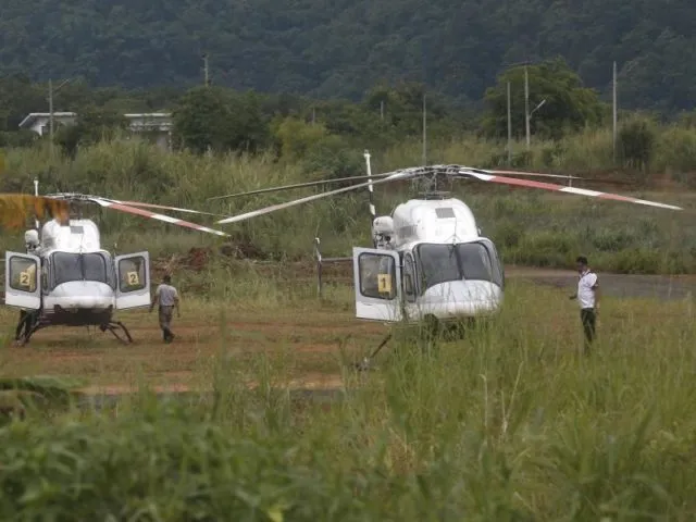 In der Nähe der Höhle stehen Hubschrauber, um die geretteten Kinder ins Krankenhaus zu bringen.