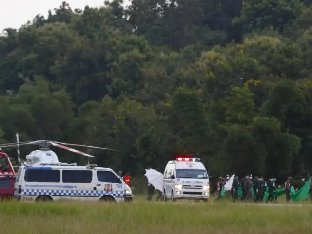 Die letzten geretteten Jungen samt ihrem Trainer werden zu einem Helikopter gebracht. Spezailtaucher haben nun auch die letzten Verbliebenen aus der gefluteten Höhle gerettet.