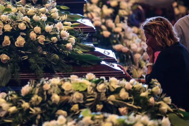 Im Beisein der Spitzen von Staat und Regierung fand die Zeremonie am Samstag in einer Messehalle statt. Allerdings blieben etliche Angehörige der Trauerfeier in der norditalienischen Stadt fern. Einige zogen private Trauerfeiern in ihren Heimatorten vor, andere boykottierten die Veranstaltung aus Protest gegen die Regierung.
