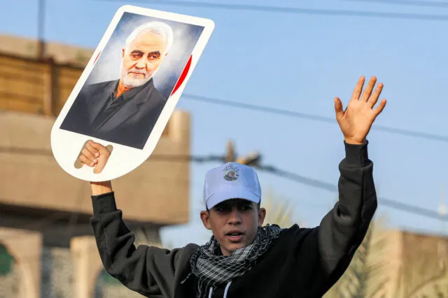 Ein Jugendlicher schwenkt ein Schild mit einem Bild von Qasem Soleimani während eines Marsches zum Jahrestag seiner Ermordung am 1. Januar 2024 in Bagdads westlichem Vorort Shuala in der Nähe des internationalen Flughafens Bagdad.