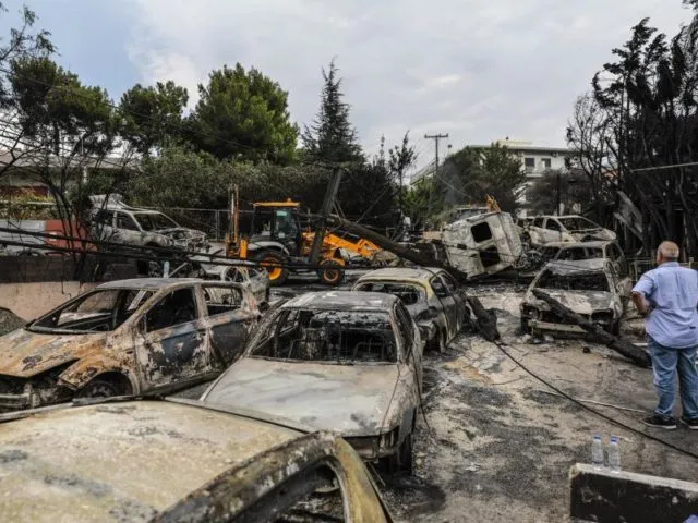 Ein Mann blickt auf verbrannte Fahrzeuge in der Küstenstadt Mati.