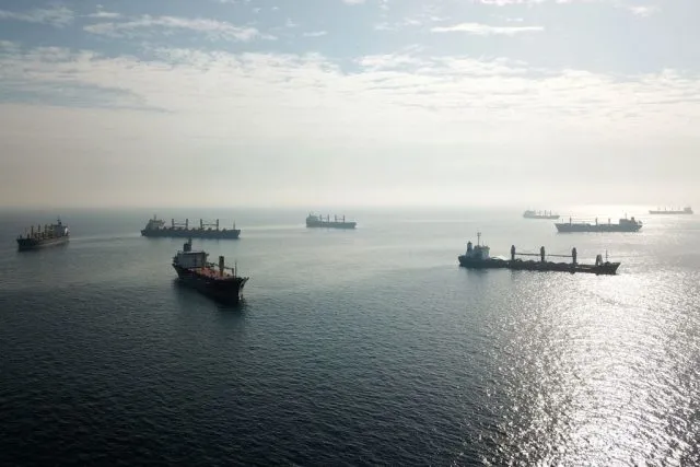 Eine Luftaufnahme vom 31. Oktober 2022 zeigt mit Getreide beladene Frachtschiffe im Ankerbereich des südlichen Eingangs zum Bosporus in Istanbul.