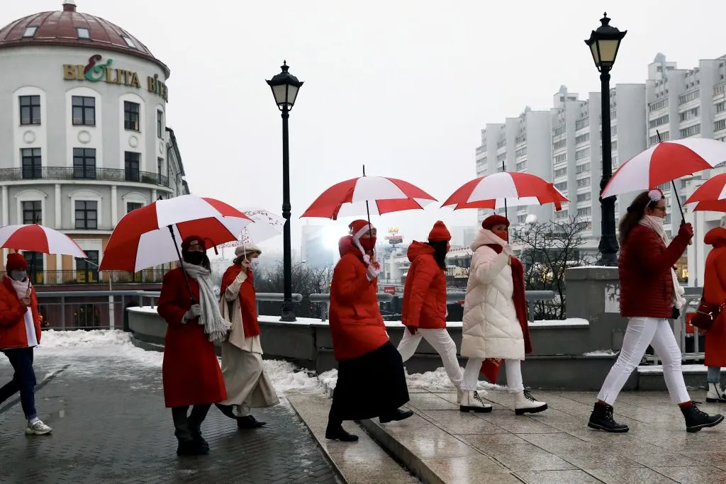 Frauen, die Kleidung mit den Farben der ehemaligen weiß-roten Flagge Weißrusslands tragen, marschieren unter Regenschirmen durch die Straßen, um gegen die Ergebnisse der weißrussischen Präsidentschaftswahlen in Minsk zu protestieren, am 16. Dezember 2020.