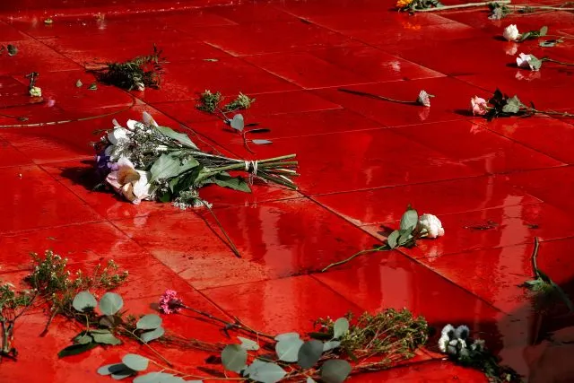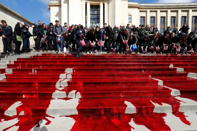 Aktivisten schütten 300 Liter Kunstblut vor den Eiffelturm.
