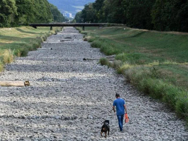 Ein Mann läuft mit seinem Hund im ausgetrockneten Flussbett der Dreisam in Freiburg spazieren.