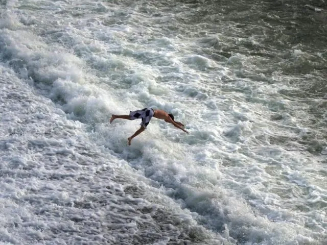Ein junger Mann springt am Lechwehr in Bayern in die kühlen Fluten des Lechs.