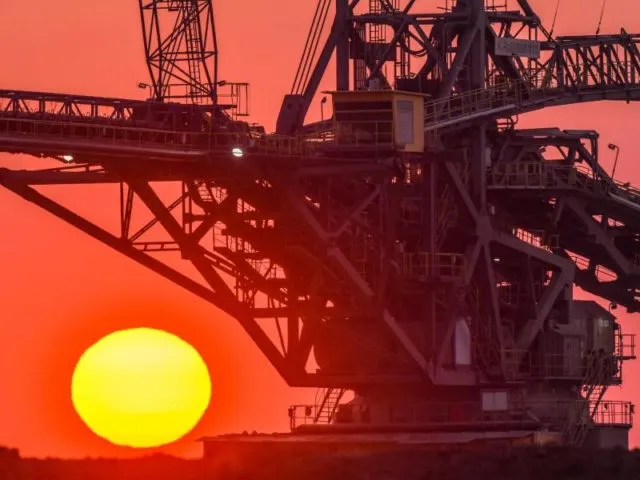 Die Sonne scheint hinter einem Absetzer für Abraum am Rande des Braunkohletagebaus Jänschwalde der LEAG.