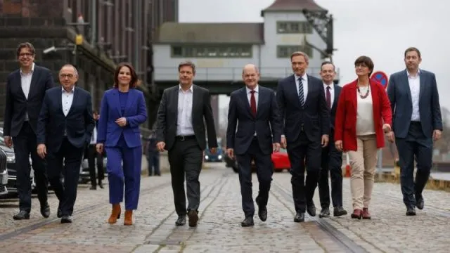 Ampelpolitiker auf dem Weg zur Pressekonferenz am 24. November 2021 in Berlin.
