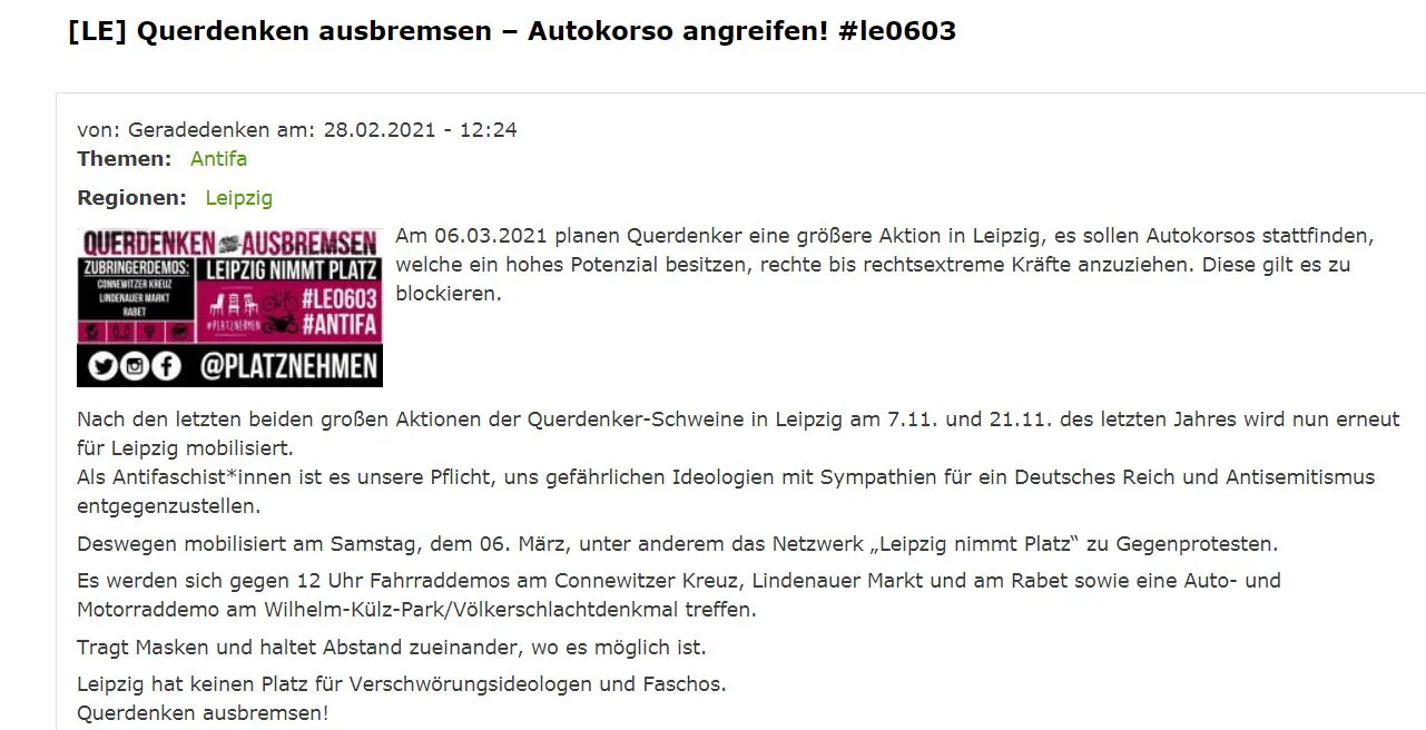 So auch auf der Leipziger Corona-Demonstration am 6. März. Die Gegenproteste in Leipzig wurden unter anderem von dem Aktionsnetzwerk „Leipzig nimmt Platz“ organisiert. Auf der linksextremen Plattform „Indymedia“ teilte die Antifa unter dem Titel „Querdenken ausbremsen – Autokorso angreifen“ den Aufruf des Netzwerkes und kündigte ihren Einsatz gegen die „gefährlichen Ideologien“ der „Querdenken-Schweine“ an.