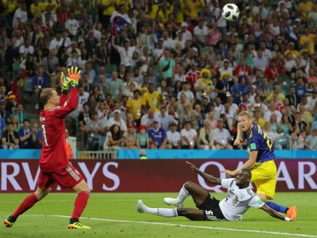 Ola Toivonen (r) erzielt gegen Antonio Rüdiger (M) und den chancenlosen Manuel Neuer das Tor zum 1:0 für Schweden.