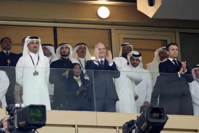 Gianni Infantino, Präsident der FIFA, und der französische Präsident Emmanuel Macron vor dem Endspiel der FIFA Fußballweltmeisterschaft Katar 2022.