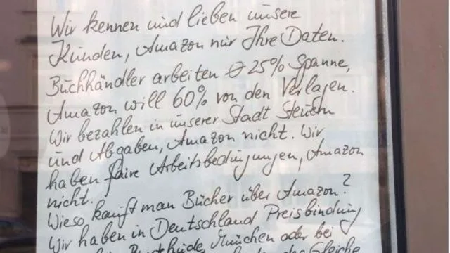 Der Buchhändler hing das Schreiben an seinem Laden „Lentner“ in München auf. „Wir kennen und lieben unsere Kunden, Amazon nur Ihre Daten“, heißt es in dem Schreiben. Buchhändler würden nur mit 25 Prozent Spanne arbeiten, Amazon hingegen mit 60 Prozent, steht auf dem Aushang. „Wir bezahlen in unserer Stadt Steuern und Abgaben, Amazon nicht.“