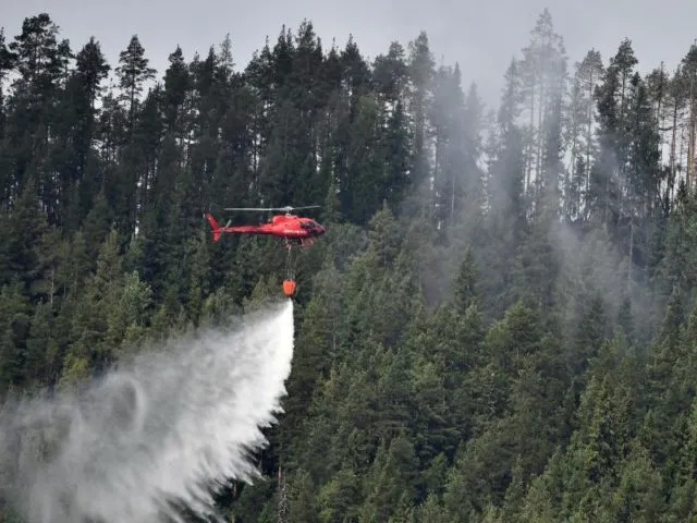 Ein Hubschrauber bekämpft einen der zahlreichen Waldbrände in Schweden.