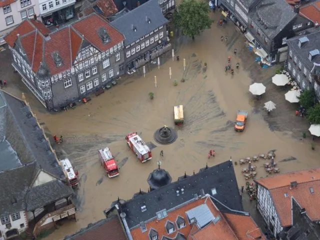 Feuerwehrfahrzeuge auf dem schlammbedeckten Marktplatz von Goslar.