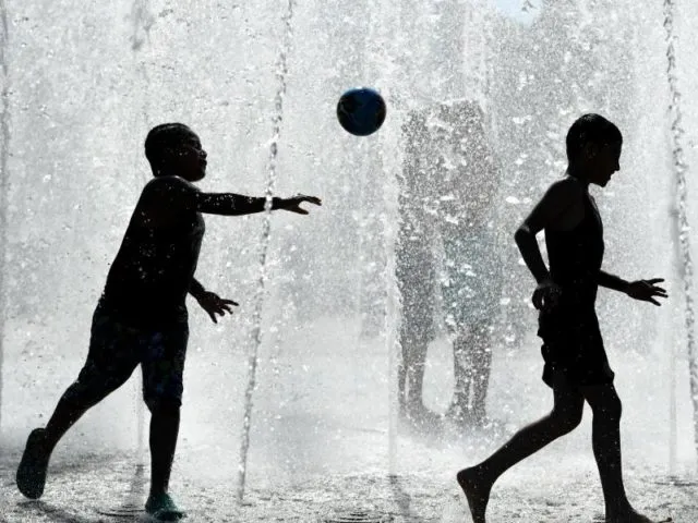 Kinder spielen in Frankfurt am Main bei hochsommerlichen Temperaturen in einem Springbrunnen.