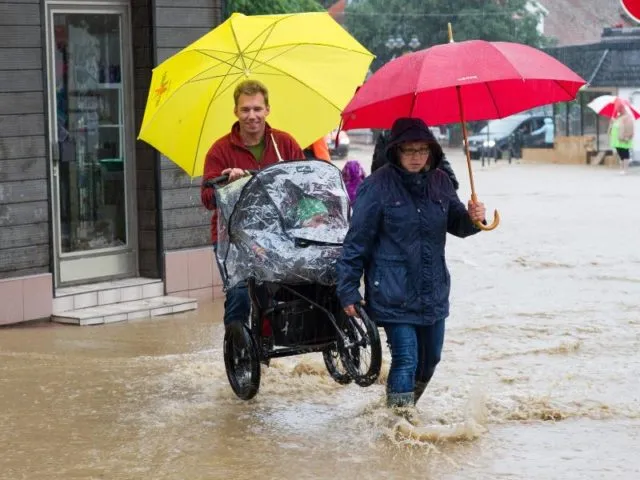 Dauerregen: Eine junge Familie kämpft sich in Bad Harzburg durch eine überflutete Straße.