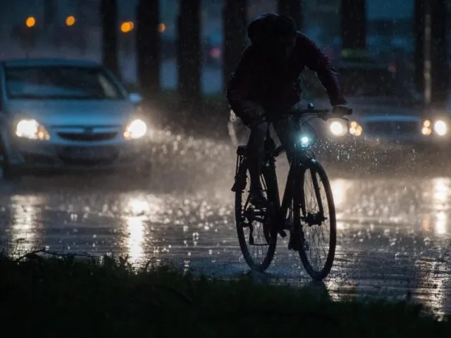 Ein Fahrradfahrer und Autos fahren bei einem Unwetter mit Starkregen.