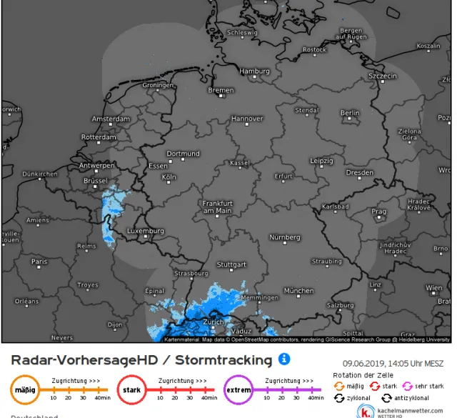 Aktuelle Gewitter können gut über die Webseite kachelmannwetter.com verfolgt werden. Das Regengebiet, welches bereits im Süden bei Basel zu erkennen ist, bewegt sich gen Nordosten in Richtung Leipzig. In diesen Bereichen kann es zu Starkregen, Hagel und kurzfristigen Überschwemmungen kommen.