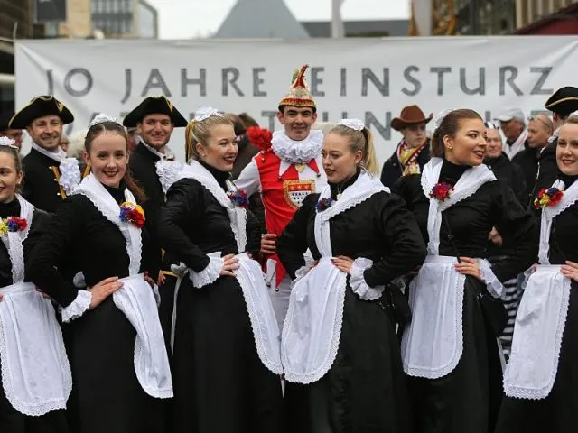 Ein Tanzgruppe am Rande der Schull- un Veedelszöch an der Einsturzstelle des Kölner Stadtarchivs vor zehn Jahren.