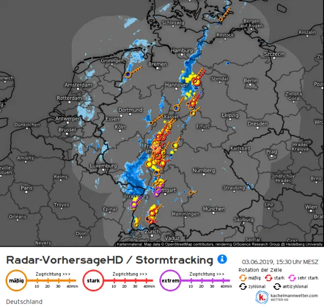 Vorsicht: Gewitter und Unwetter, 3. Juni 2019, 15:30 Uhr. Östlich von Frankfurt ist eine sich drehende Gewitterwolke aktiv (Tornadobildung möglich). Quelle: Kachelmannwetter.com / https://kachelmannwetter.com/de/stormtracking/deutschland/