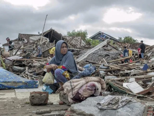 Eine Überlebende des Tsunamis in Sumur sitzt auf einem Haufen Schutt.