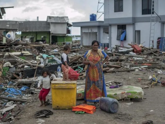 Eine Frau und ihre Kinder stehen zwischen Trümmern.