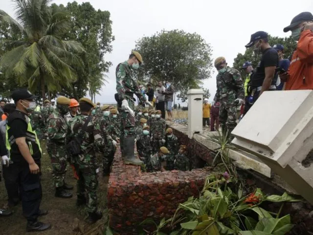 Indonesische Soldaten und Rettungskräfte suchen in einem Strand-Ressort nach Opfern.